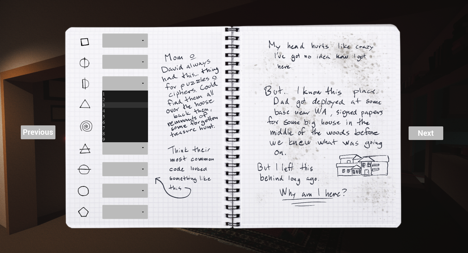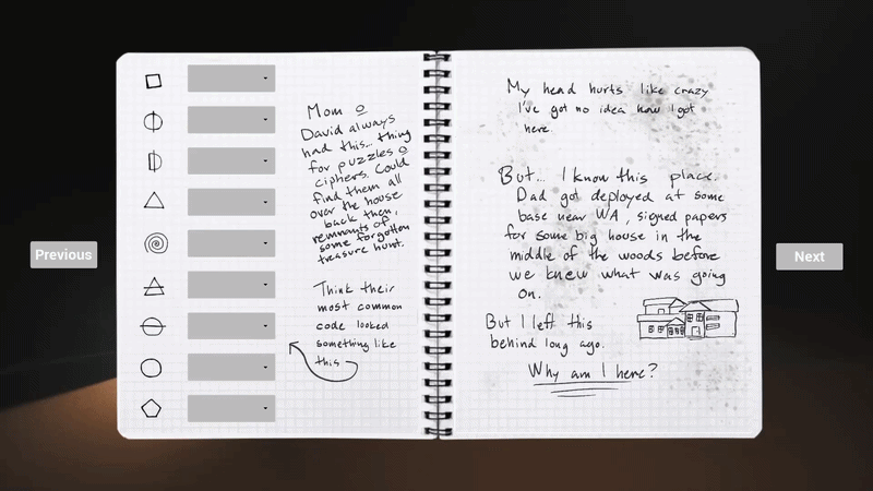 In preparation of the assignment, I worked through playing quite a few of the Rusty Lake mobile games – a large collection of 2D point-and-click puzzle games with abstract but powerful storytelling – and was hooked immediately. They had a similar system across their different games, where the pen-and-paper puzzle-solving is enforced.
