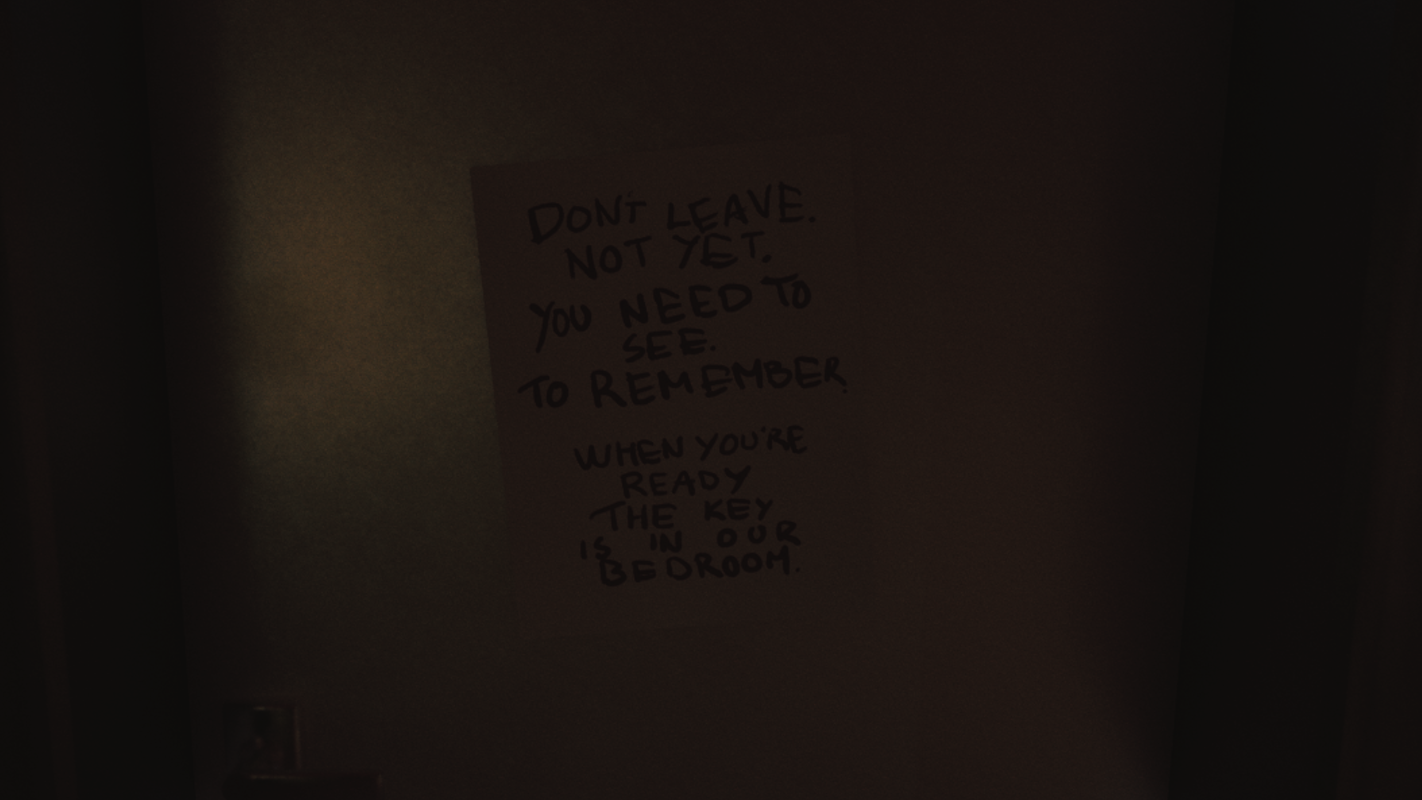 At the start of this level, the Player character awakes with a gasp. In front of them, a locked door with a note. The goal – to get to the master bedroom to get the key to leave – is presented right out of the gate.
