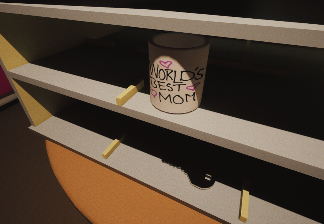When the puzzle is solved, a dollhouse opens up to reveal a key (leading to the other grate in the bathroom) and a mug with the words “World’s best mom” written on it. On your way back to the kitchen, an apparition appears in your late brother’s bedroom…